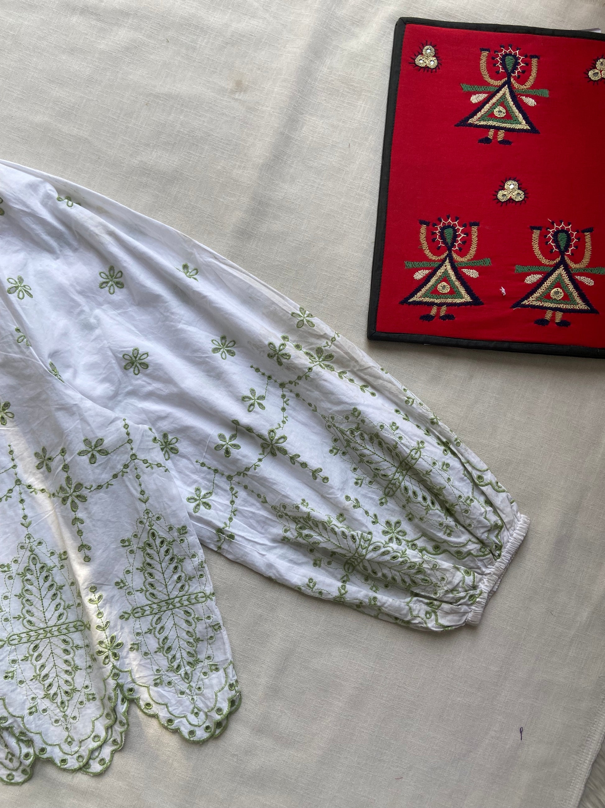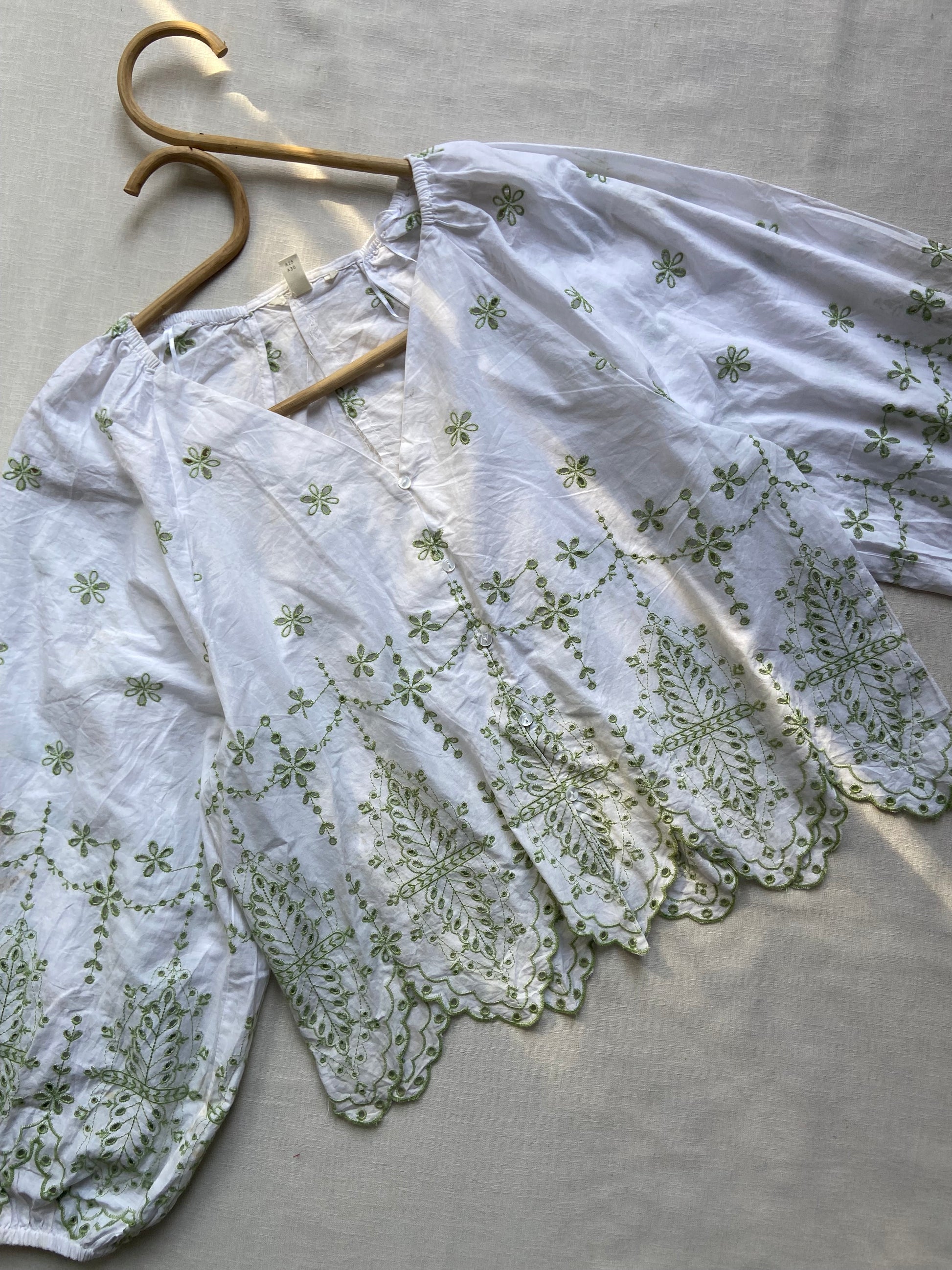 Infuse natural charm into your look with the Meadowlace Scallop Embroidered Top. This airy piece features voluminous balloon sleeves and a striking scalloped hem, finished with delicate green floral embroidery for a whimsical, artisanal touch. The relaxed silhouette sits at hip length, combining everyday comfort with sophisticated, boho-inspired detail.
