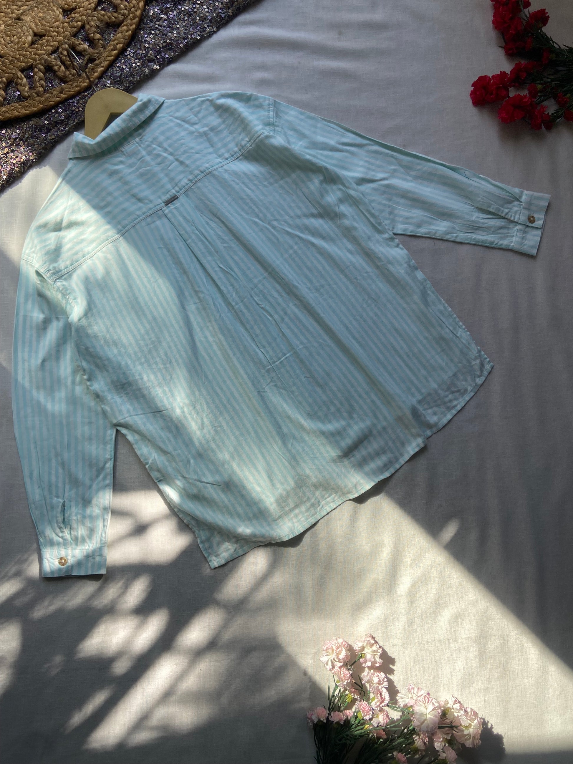 Stay cool and classic with this light blue striped cotton shirt featuring a button-down front, single chest pocket, and full sleeves. Designed for a relaxed fit with a slightly longer back hem, it's perfect for both casual and semi-formal occasions. Breathable and lightweight—ideal for everyday wear.