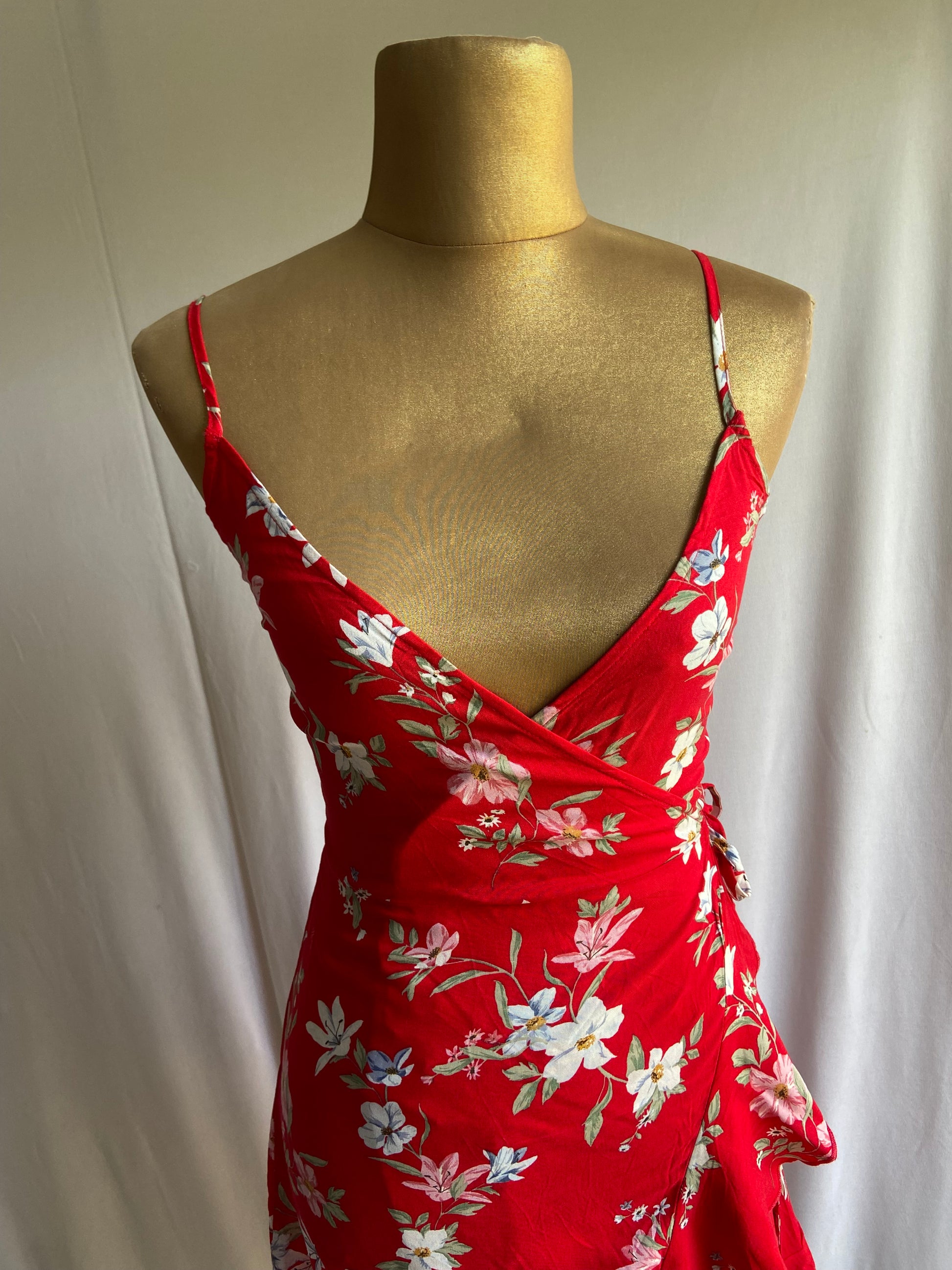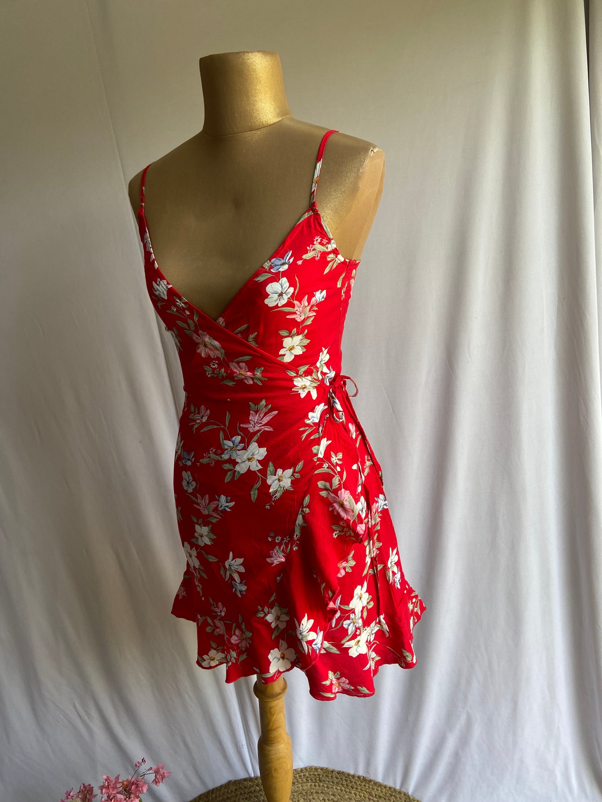 Add a pop of color to your wardrobe with this stunning red floral wrap dress. Designed with delicate spaghetti straps and a flattering V-neckline, this mini dress features a beautiful all-over floral print and a wrap-style silhouette that ties at the waist for an adjustable fit. The ruffled hem adds a playful, feminine touch, perfect for summer outings, beach vacations, or casual brunch dates. Made from lightweight, breathable fabric, this dress combines comfort and style effortlessly.