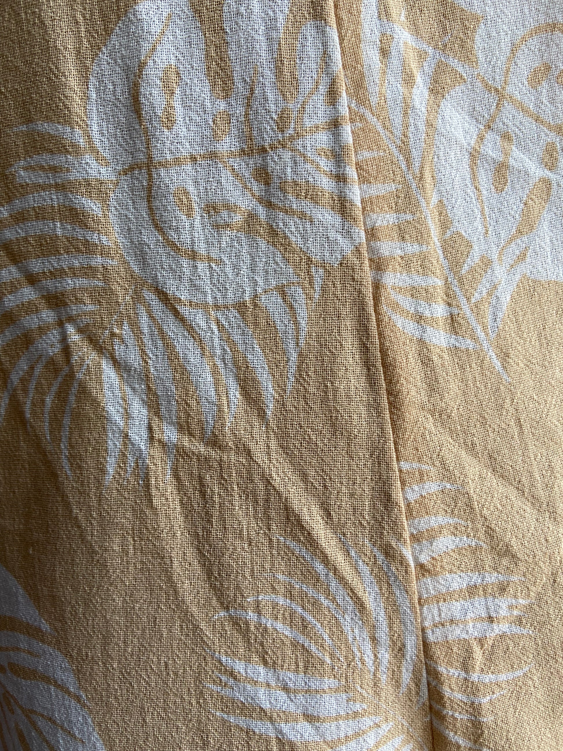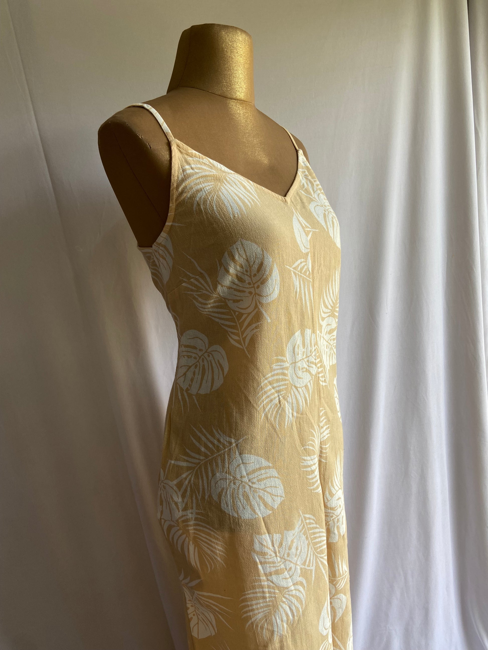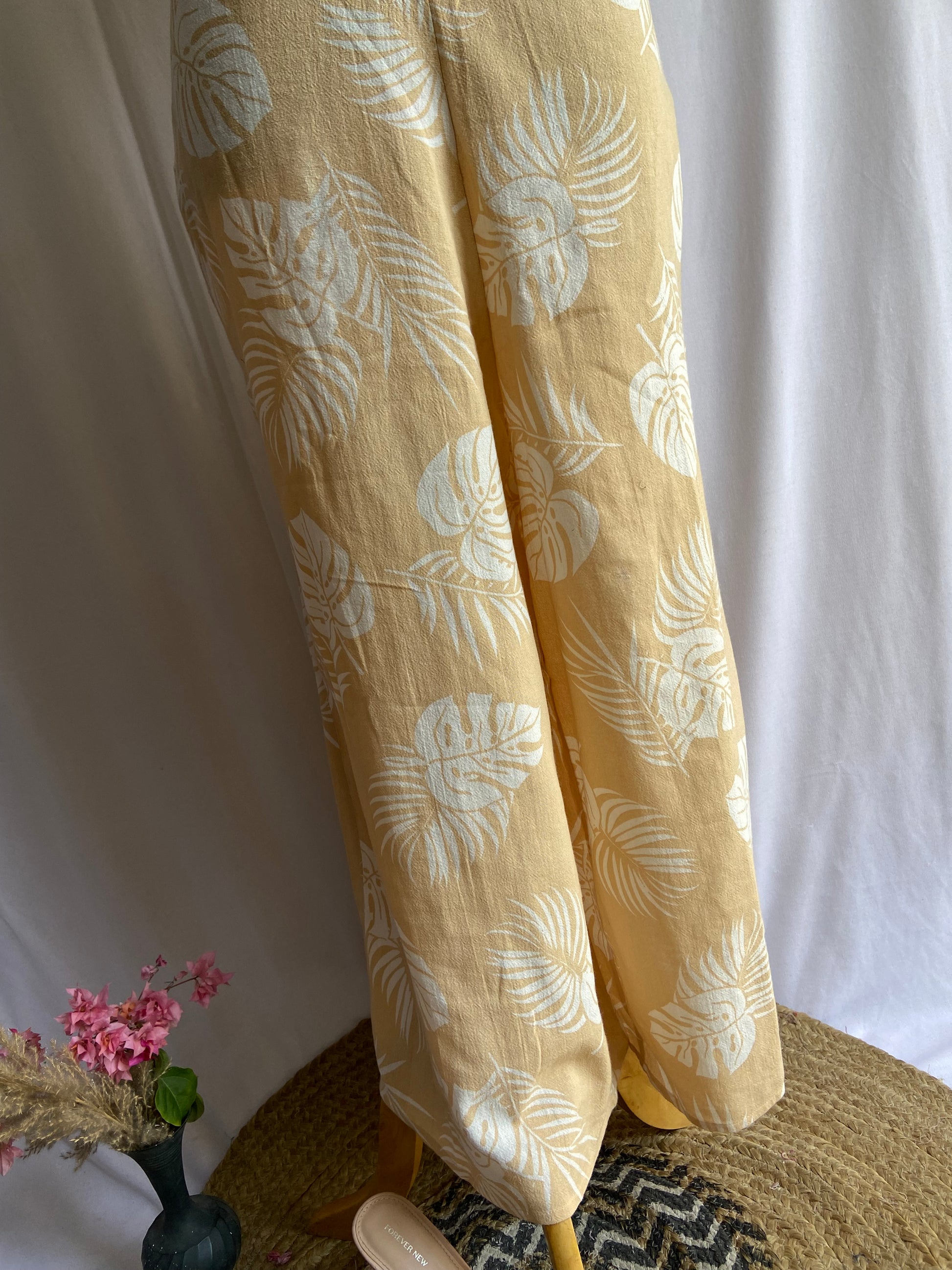 Step into effortless style with this elegant yellow jumpsuit featuring a delicate white leaf print. Designed with thin adjustable spaghetti straps and a flattering V-neckline, this sleeveless jumpsuit offers a breezy and comfortable fit perfect for warm weather. The wide-leg cut adds a touch of sophistication while ensuring ease of movement. Ideal for casual outings, beach days, or summer parties, this jumpsuit combines comfort and chic style in one versatile piece.