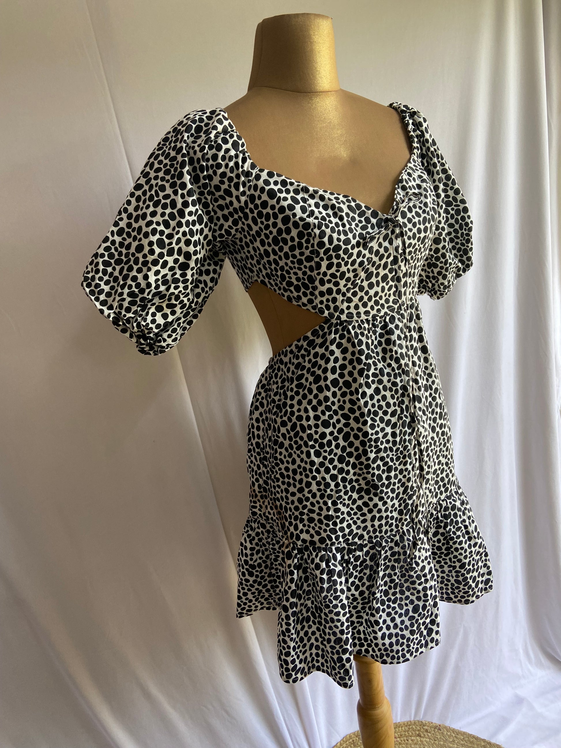 Make a bold and playful statement with this stylish black and white polka dot dress. Designed with dramatic puff sleeves and a flattering sweetheart neckline, this dress features a trendy front cut-out detail that adds a modern edge. The fitted bodice flows into a tiered skirt with subtle ruffles, offering movement and charm. Perfect for summer outings, brunch dates, or vacation looks, this dress blends classic polka dot print with contemporary flair.