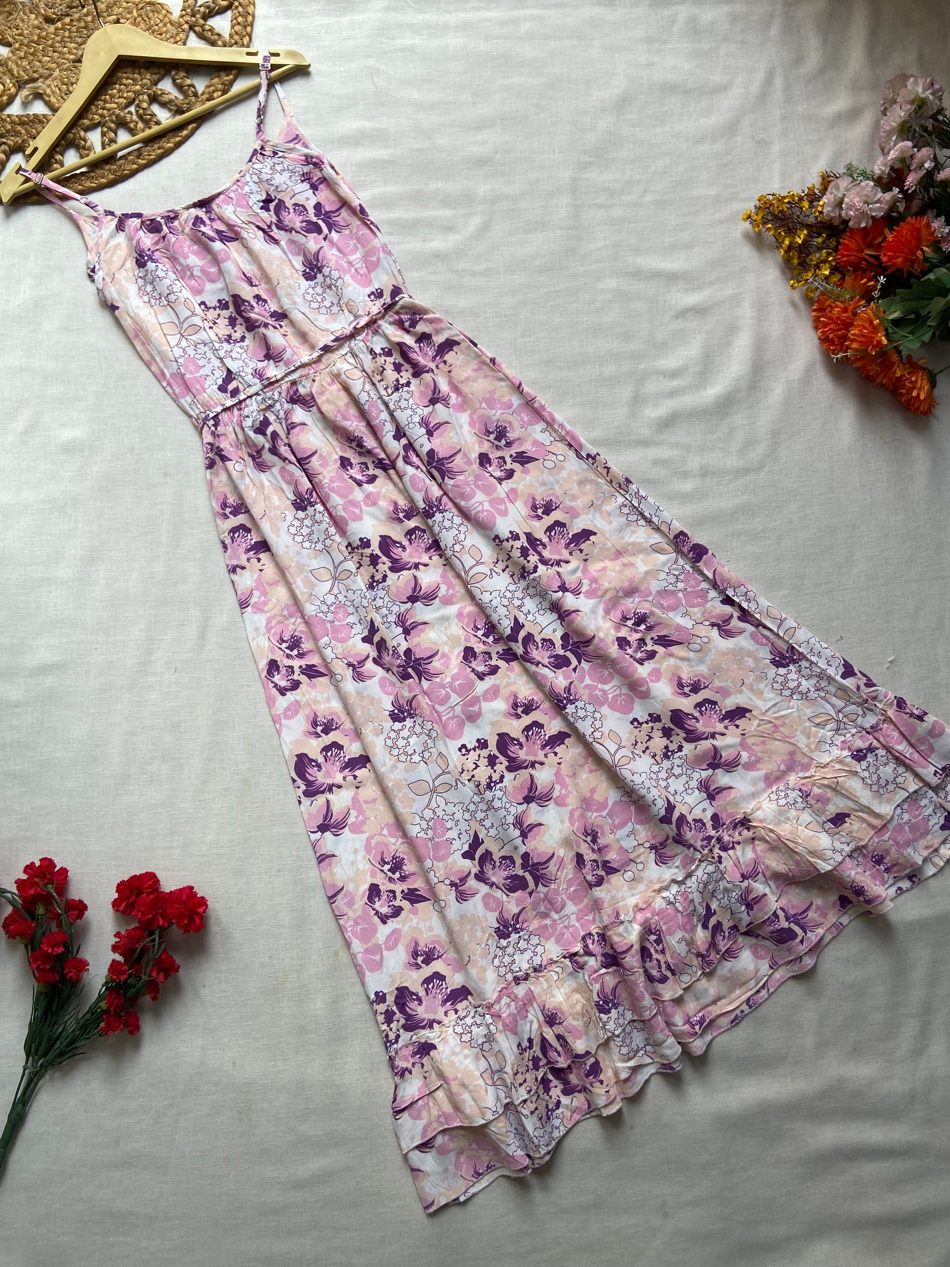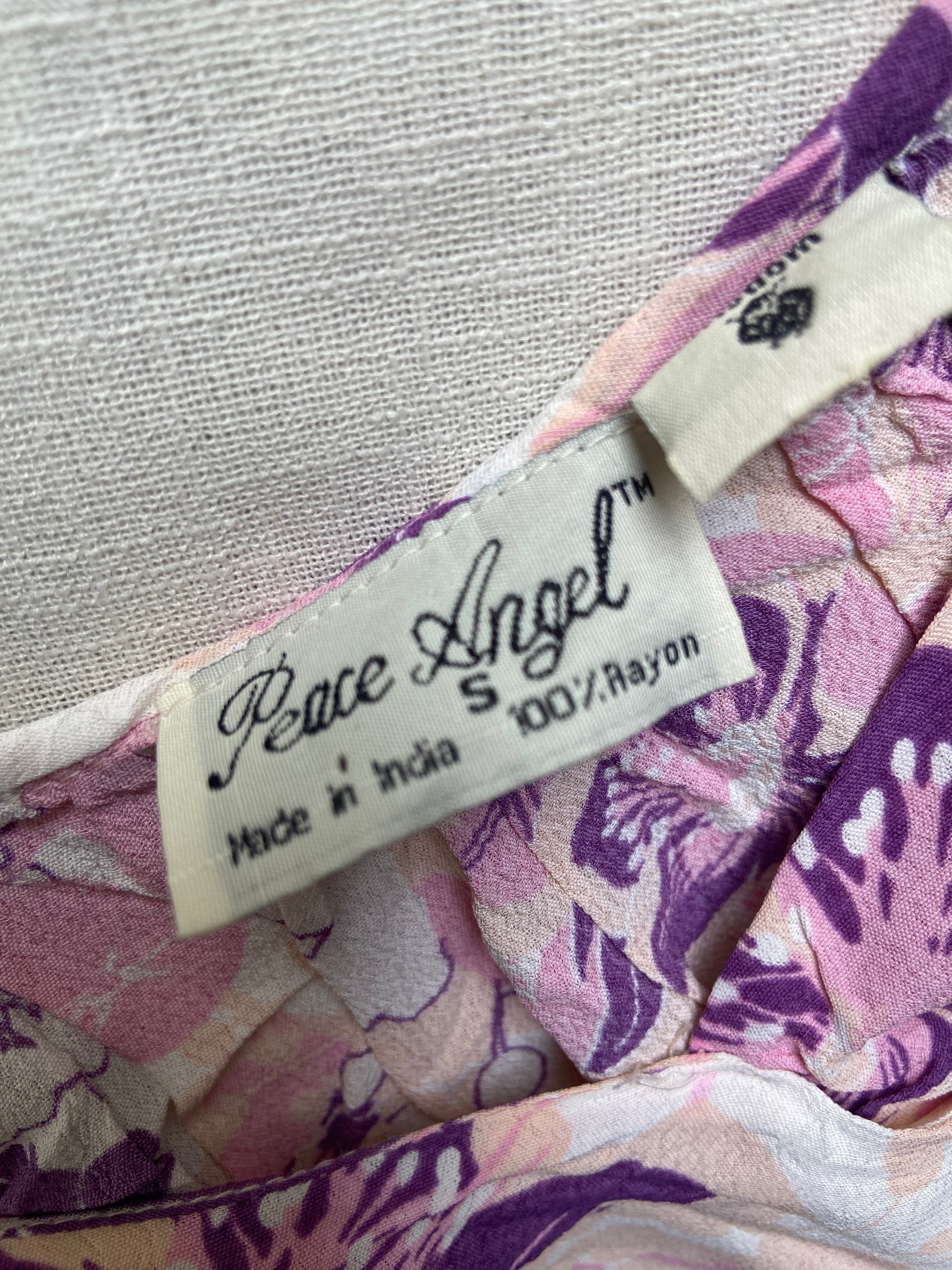This white beach maxi dress in size small from Peace Angel features a strap design and peplum detailing at the bottom, enhancing its feminine silhouette. Adorned with a pink and purple floral print and an elasticated waist, it offers both comfort and style. Perfectly suited for beach outings, it pairs beautifully with sandals and a sunhat for a relaxed yet elegant look.