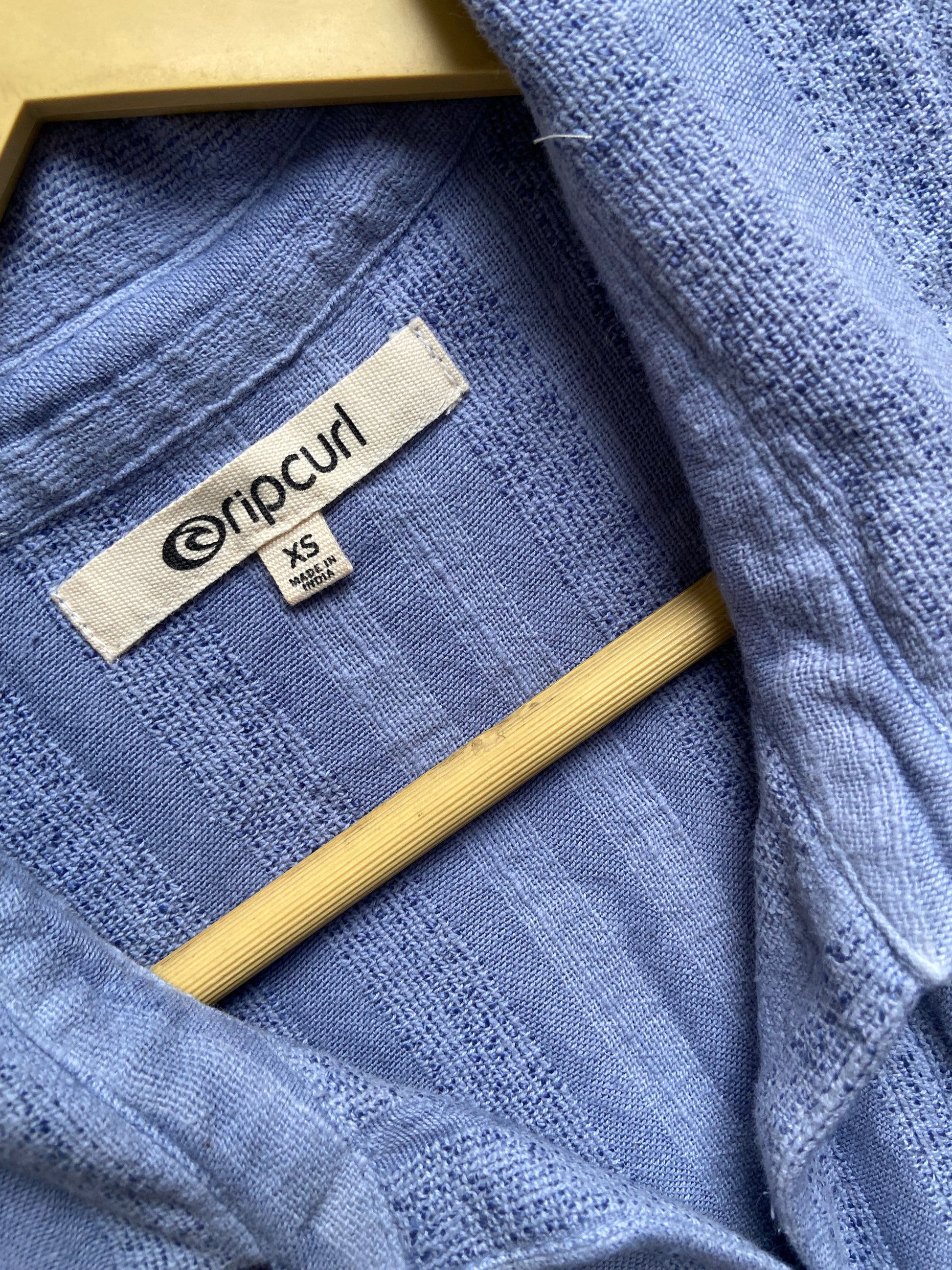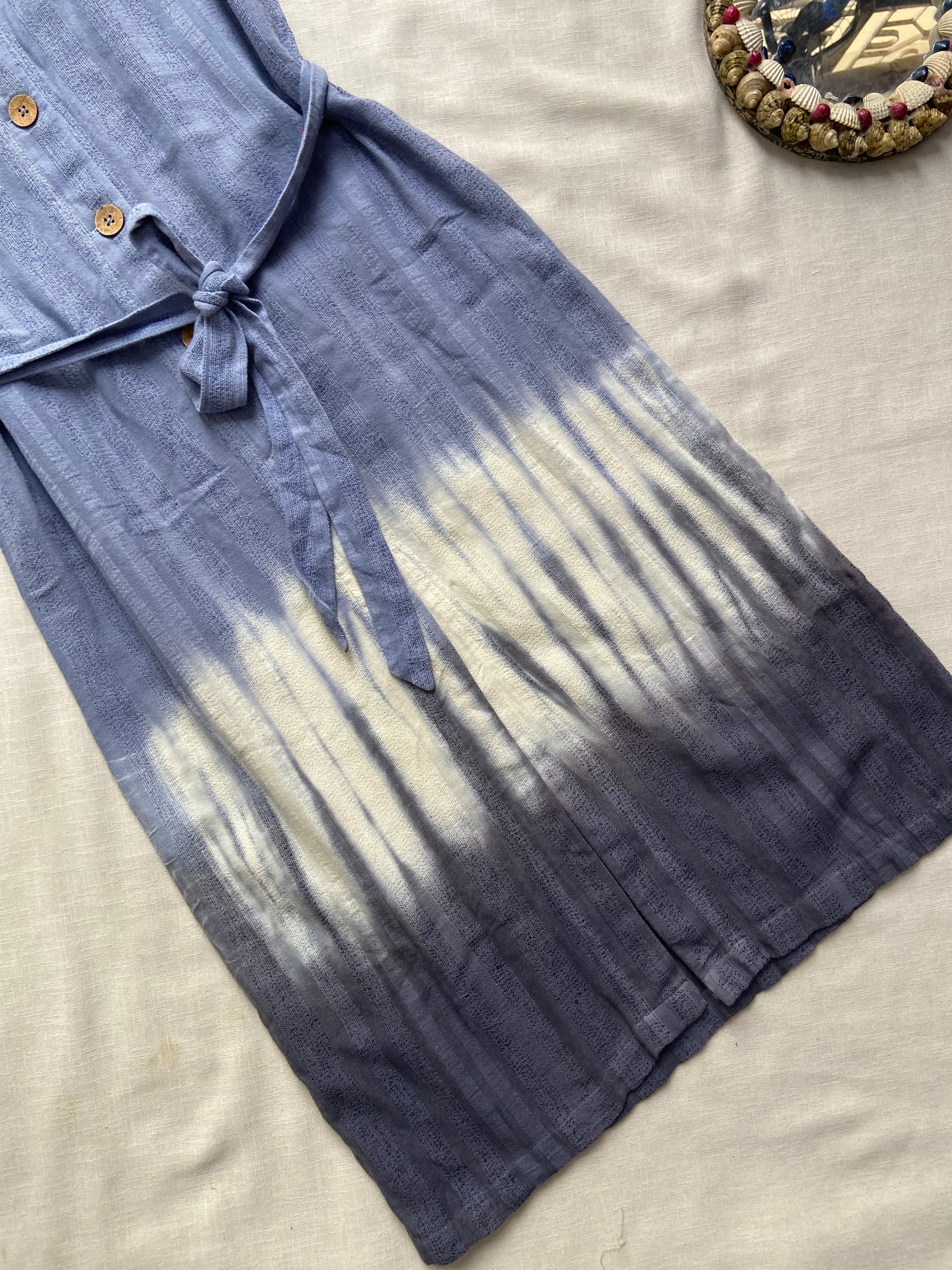 This Ripcurl A-line maxi dress in size XS features a striking tie and dye pattern in shades of blue, white, and dark blue. Made from breathable cotton fabric, it offers comfort and style with a classic collared design and button-down front. The waist belt accentuates your silhouette, creating a flattering fit. Perfect for casual outings or beach days, this dress pairs well with sandals or espadrilles for a relaxed yet polished look.
