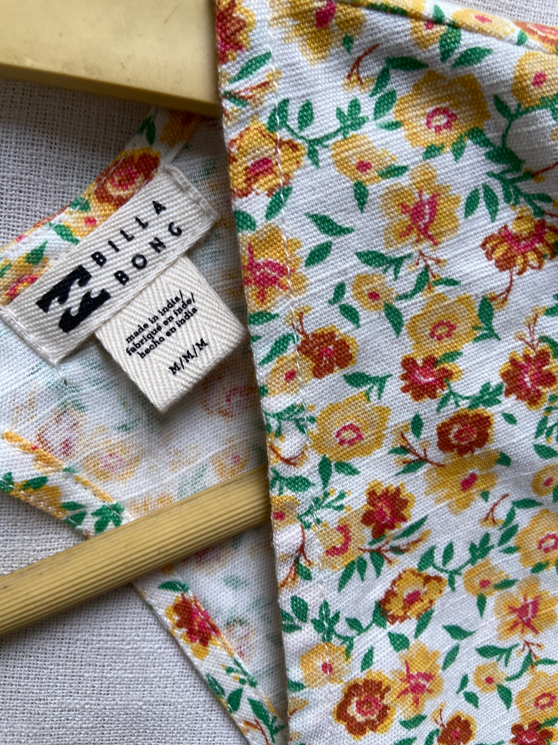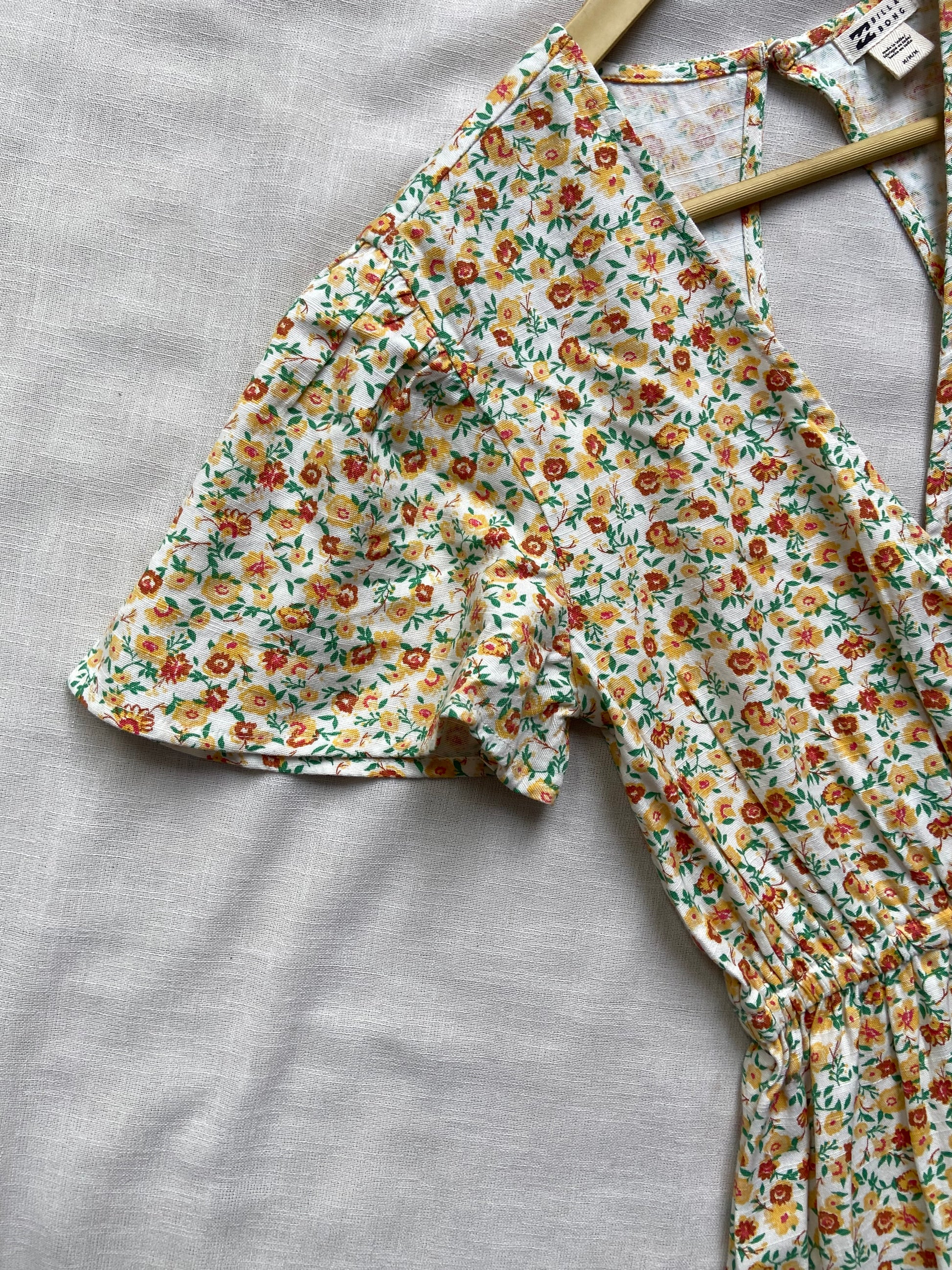 This off-white mini dress from Billabong features a flattering V-neck and delicate floral print, crafted from breathable cotton fabric for all-day comfort. Designed with quarter sleeves and an elasticated waist, it offers a tailored fit that enhances your silhouette. The peplum detailing at the bottom adds a stylish, feminine touch. Ideal for casual outings or beach days, pair it with sandals or wedges for a chic, effortless look. Perfect for those seeking a blend of comfort and contemporary style.