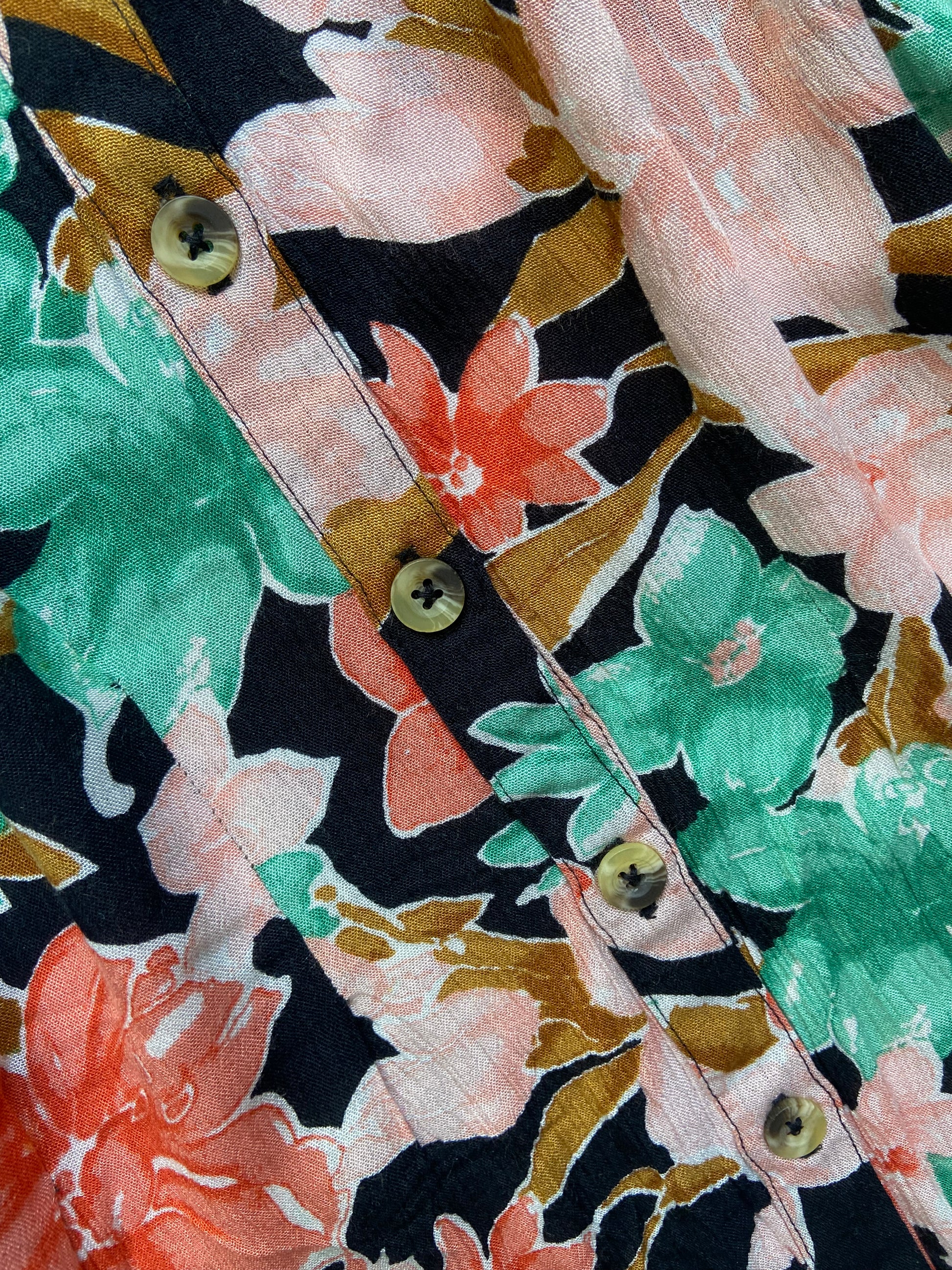 Embrace fun and effortless style with this vibrant tropical floral print romper. Designed with a flattering V-neckline, flutter sleeves, and a button-front detail, this romper is perfect for sunny days and casual outings. The lightweight, breathable fabric keeps you cool and comfortable, while the eye-catching mix of coral, pink, green, and black adds a playful, summery vibe. Whether you're heading to the beach, brunch, or a weekend getaway, this romper is a chic and easy outfit choice.